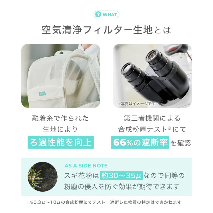 静電気の力で花粉やホコリから赤ちゃんをガード。マスクがつけられない赤ちゃんを抱っこしながら守る話題のベビーマスクです。抱っこ紐に簡単装着でき、通気性・肌触りも快適で赤ちゃんもママパパも安心です。